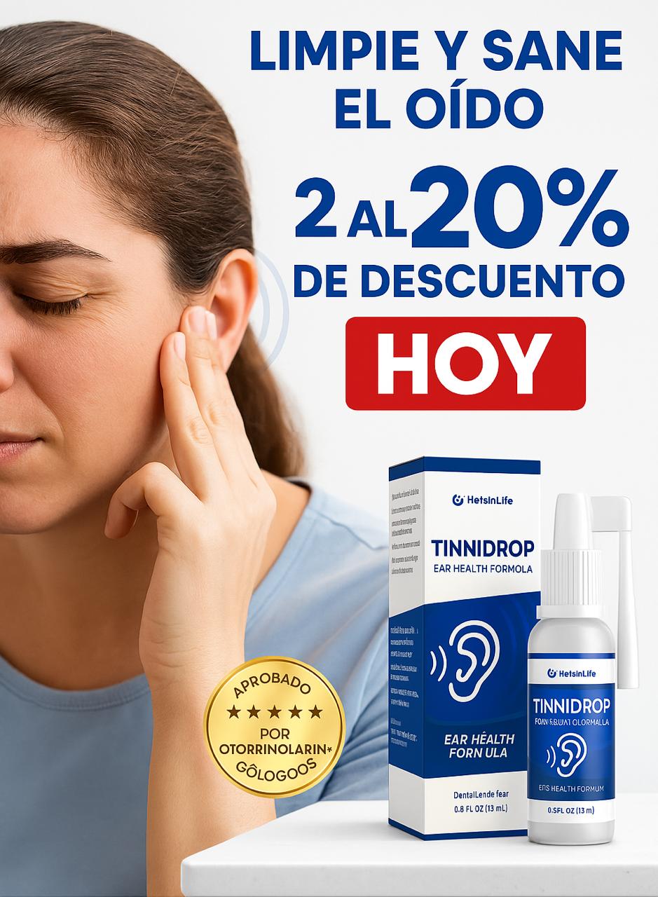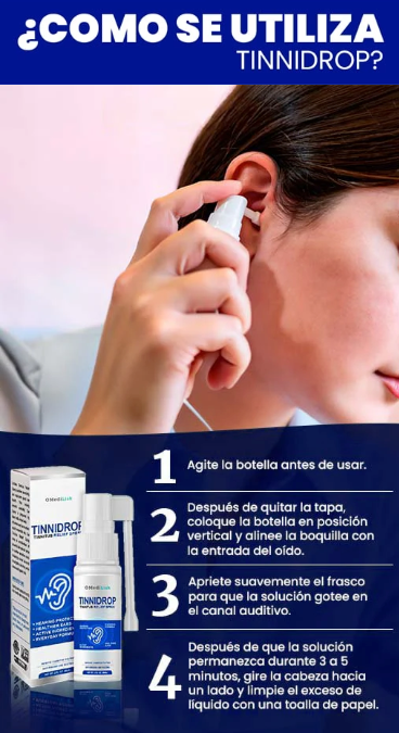 😩 ¿Sufres de tinnitus y acumulación de cera en los oídos? 👂El Spray Limpiador de Oído TinniDrop es tu solución definitiva. Diseñado para limpiar eficazmente tus oídos y reducir los síntomas del tinnitus, este spray mejora tu salud auditiva y calidad de vida. ✅